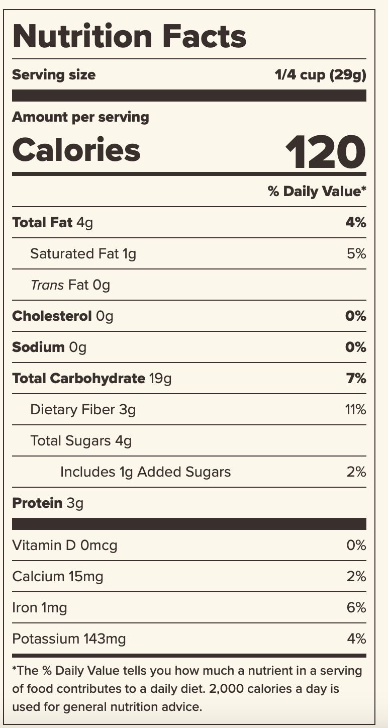 Ingredients: Whole Grain Oats, Raisins (Raisins, Sunflower Oil), Almonds, Sunflower Seeds, Dried Cranberries (Cranberries, Sugar, Sunflower Oil), Brown Rice Crisps (Rice Flour, Rice Bran, Honey), Dried Apples, Coconut, Pumpkin Seeds.