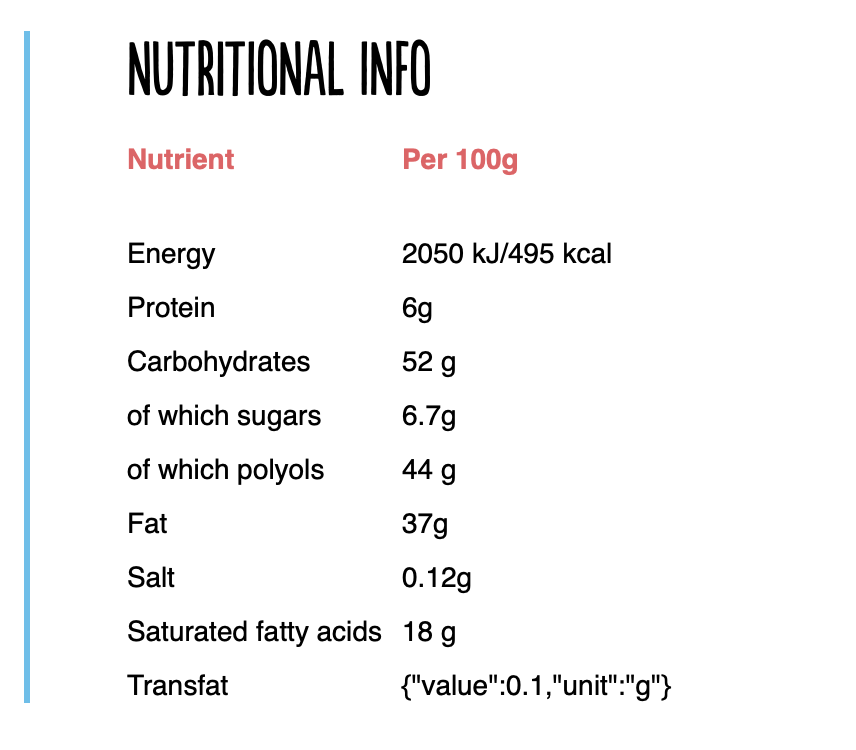 Sweeteners (Maltitol and steviol glycosides (0.02%)), cocoa butter, whole milk powder, hazelnut (12%), cocoa paste, butter, emulsifier (soya lecithin) and flavouring. Cocoa: 30% minimum. Contains naturally occurring sugars. Excessive consumption may produce laxative effects.