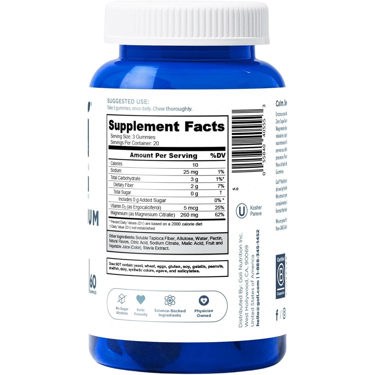 Goli Nutrition Magnesium Zero Sugar Gummies deliver a clean, convenient way to top up your daily magnesium—an essential mineral for muscle function, nerve health, and balanced energy. Each serving provides 260 mg of magnesium with zero sugar and no artificial sweeteners, crafted in a vegan, gluten-free, non-GMO, and gelatin-free gummy you’ll actually enjoy.
