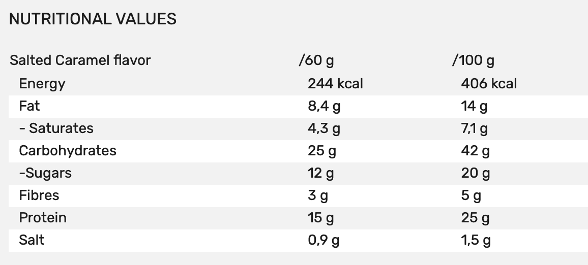 Salted Caramel flavor : Milk protein, brown sugar, vegetable glycerine, wheat flour (wheat flour, calcium carbonate, iron, niacin, thiamin), hydrolysed wheat protein, dark chocolate chips (9%) (cocoa mass, sugar, emulsifier (soylecithin), flavoring), olive oil, coconut oil, soluble maize fibre, raising agents (cream of tartar, sodium bicarbonate), flavoring, salt.