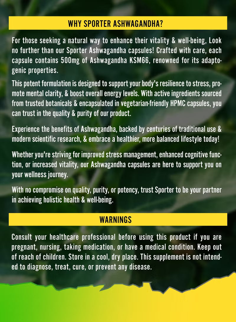 Support your mind and body with Sporter Ashwagandha Extract, made with the most clinically studied form—KSM-66®. Each serving delivers 1000mg of high-strength Ashwagandha root extract, known for its powerful adaptogenic properties that help the body manage stress, improve mood, support restful sleep, and boost immunity. Perfect for those looking for natural balance and well-being, this formula comes in vegan-friendly capsules suitable for daily use.