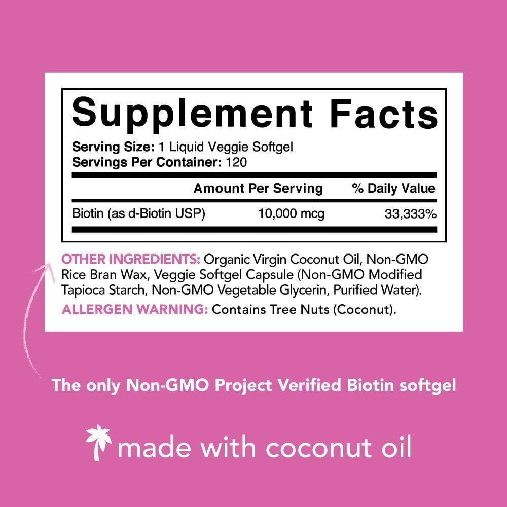 Organic virgin coconut oil, Plantgel capsule (non-GMO modified tapioca starch, vegetable glycerin, purified water), rice bran wax, Biotin.