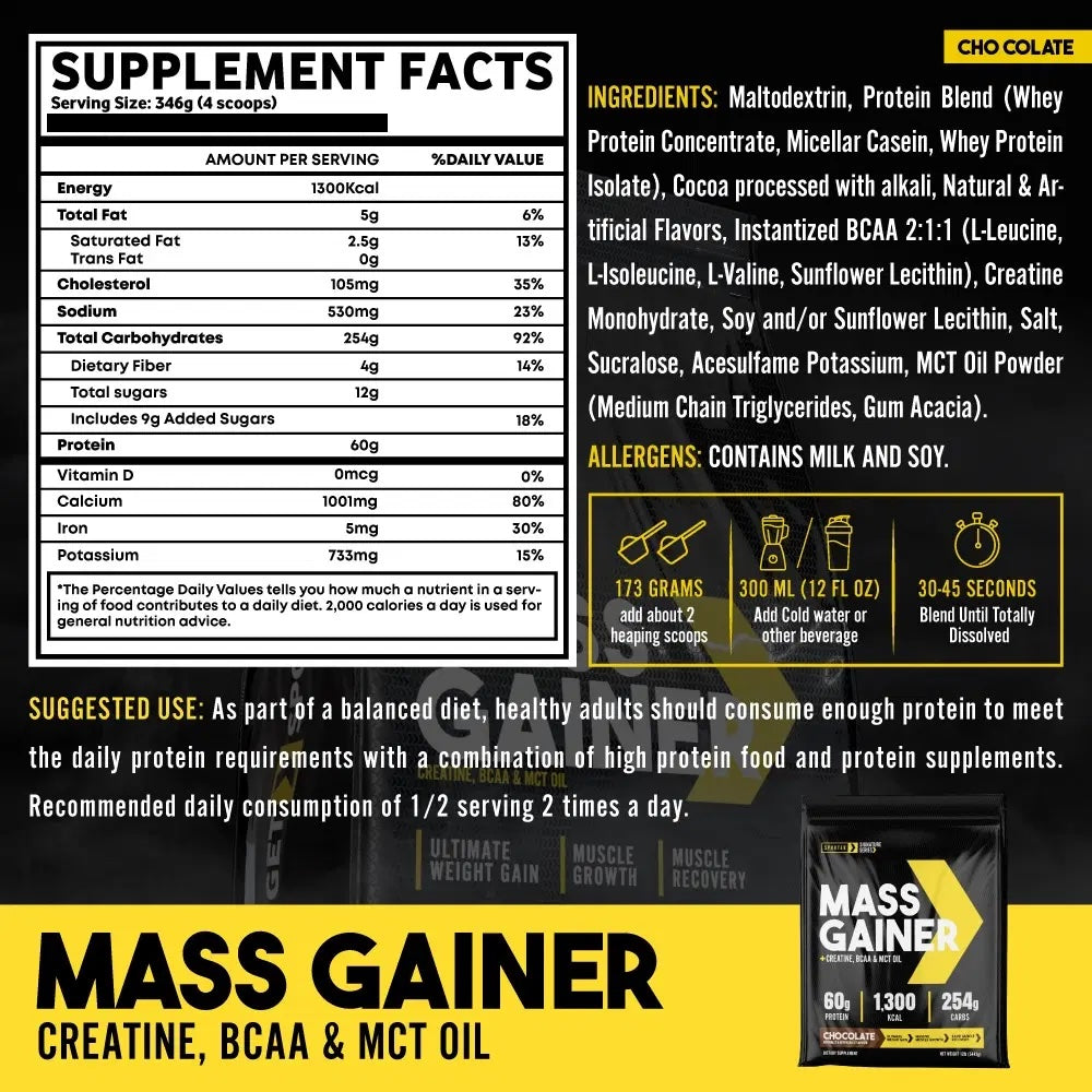 يحتوي سبورتر هاي-بروتين ماس جاينر على 60 غرامًا من بروتين مصل اللبن المُركّز، وبروتين مصل اللبن المعزول، وكازين ميسيلار. يمنحك مزيج البروتينات سريعة الهضم وبطيئة الهضم القدرة على إطلاق الأحماض الأمينية باستمرار طوال اليوم، مما يُساعدك على بناء عضلات أكبر. بالإضافة إلى ذلك، يحتوي على 1300 سعرة حرارية، و254 غرامًا من الكربوهيدرات عالية الجودة، وزيت MCT كمصدر للدهون، وأحماض BCAAs لبناء العضلات، والكرياتين لزيادة قدرة تحمل العضلات، وغيرها الكثير. ستساعدك هذه العناصر الغذائية على التعافي بشكل أسرع، وتعزيز مستويات الطاقة لديك، وزيادة حجم وكتلة العضلات.