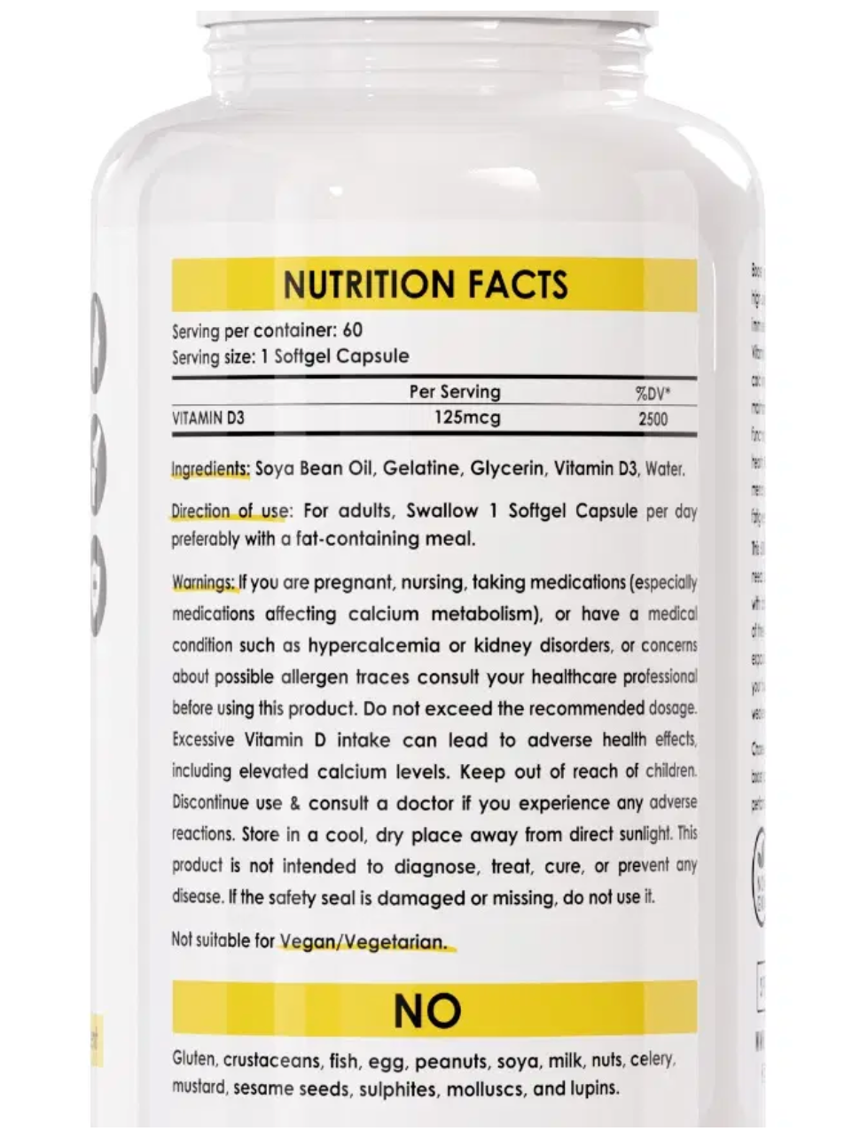 تحذيرات: إذا كنتِ حاملاً، أو مرضعة، أو تتناولين أدوية (خاصةً الأدوية التي تؤثر على استقلاب الكالسيوم)، أو تعانين من حالة طبية مثل فرط كالسيوم الدم أو اضطرابات الكلى، أو لديكِ مخاوف بشأن آثار مسببات الحساسية المحتملة، يُرجى استشارة أخصائي الرعاية الصحية قبل استخدام هذا المنتج. لا تتجاوزي الجرعة الموصى بها. قد يؤدي الإفراط في تناول فيتامين د إلى آثار صحية ضارة، بما في ذلك ارتفاع مستويات الكالسيوم. يُحفظ بعيدًا عن متناول الأطفال. توقفي عن الاستخدام واستشيري الطبيب في حال ظهور أي ردود فعل سلبية. يُحفظ في مكان بارد وجاف بعيدًا عن أشعة الشمس المباشرة. هذا المنتج غير مخصص لتشخيص أو علاج أو الوقاية من أي مرض. في حال تلف ختم الأمان أو فقدانه، لا تستخدميه.