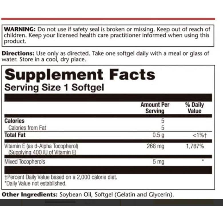يوفر فيتامين E د-ألفا توكوفيرول من سولاراي 268 ملغ (400 وحدة دولية) من د-ألفا توكوفيرول الممتاز من مصادر طبيعية لكل كبسولة هلامية مصممة لدعم صحة القلب والأوعية الدموية والجلد. يعمل هذا العنصر الغذائي الفعال المضاد للأكسدة على حماية خلاياك من الإجهاد التأكسدي وأضرار الجذور الحرة. يجمع كل كبسولة هلامية بين د-ألفا توكوفيرول غير المُستَقر مع مزيج تآزري من التوكوفيرول المختلط لتعزيز التوافر البيولوجي. صُنع هذا المكمل في منشأتنا الحديثة وتم التحقق من فعاليته ونقائه في المختبر بدقة من حيث الفعالية والنقاء، مما يعكس التزامنا بالجودة والفعالية التي لا هوادة فيها.