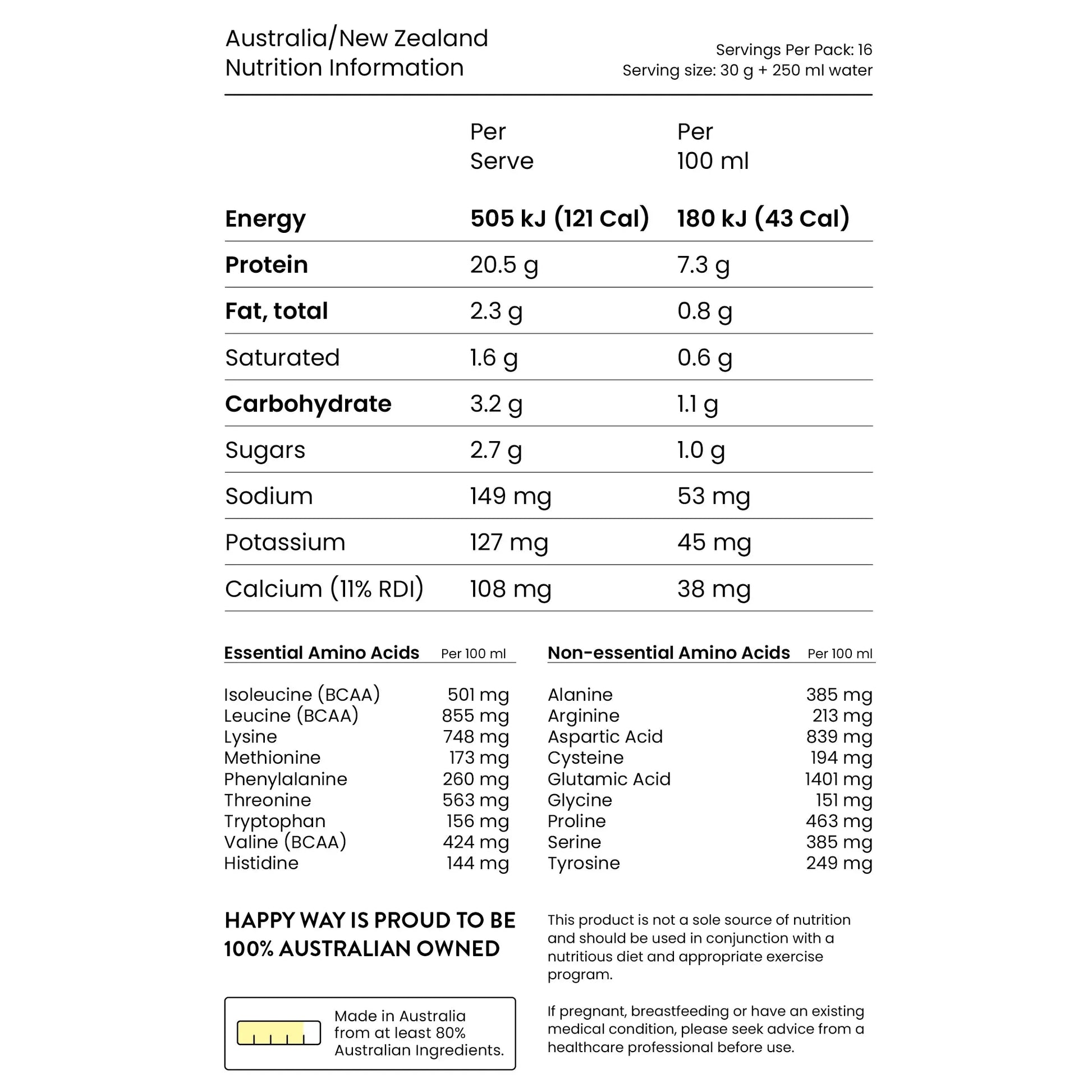 مركّز بروتين مصل اللبن المتغذّي على المراعي، دقيق جوز الهند العضوي، مسحوق توت آكاي، بذور الشيا العضوية، قشر سيلليوم عضوي، مسحوق ماكا عضوي، مسحوق توت الماكي العضوي، مُحلي (ستيفيول جليكوسيدات)، ملح صخري من الهيمالايا. خالي من الغلوتين.