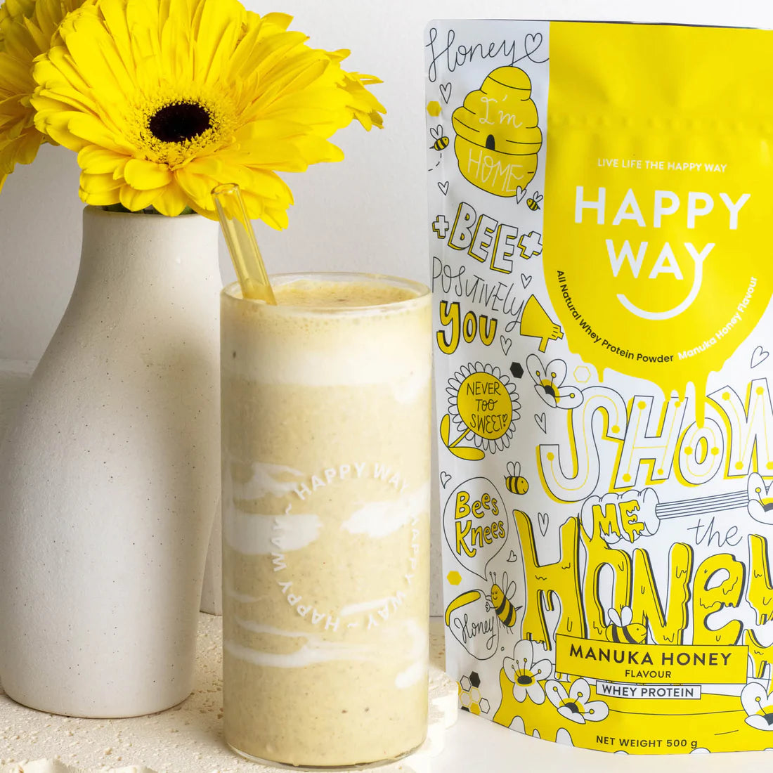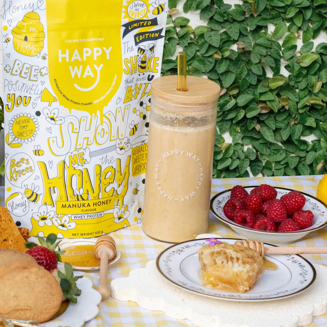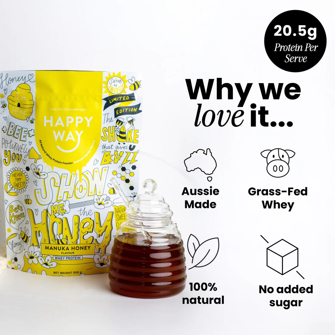 هابي واي مسحوق بروتين مصل اللبن العضوي الطبيعي بالكامل - عسل مانوكا (إصدار محدود) 500 جرام