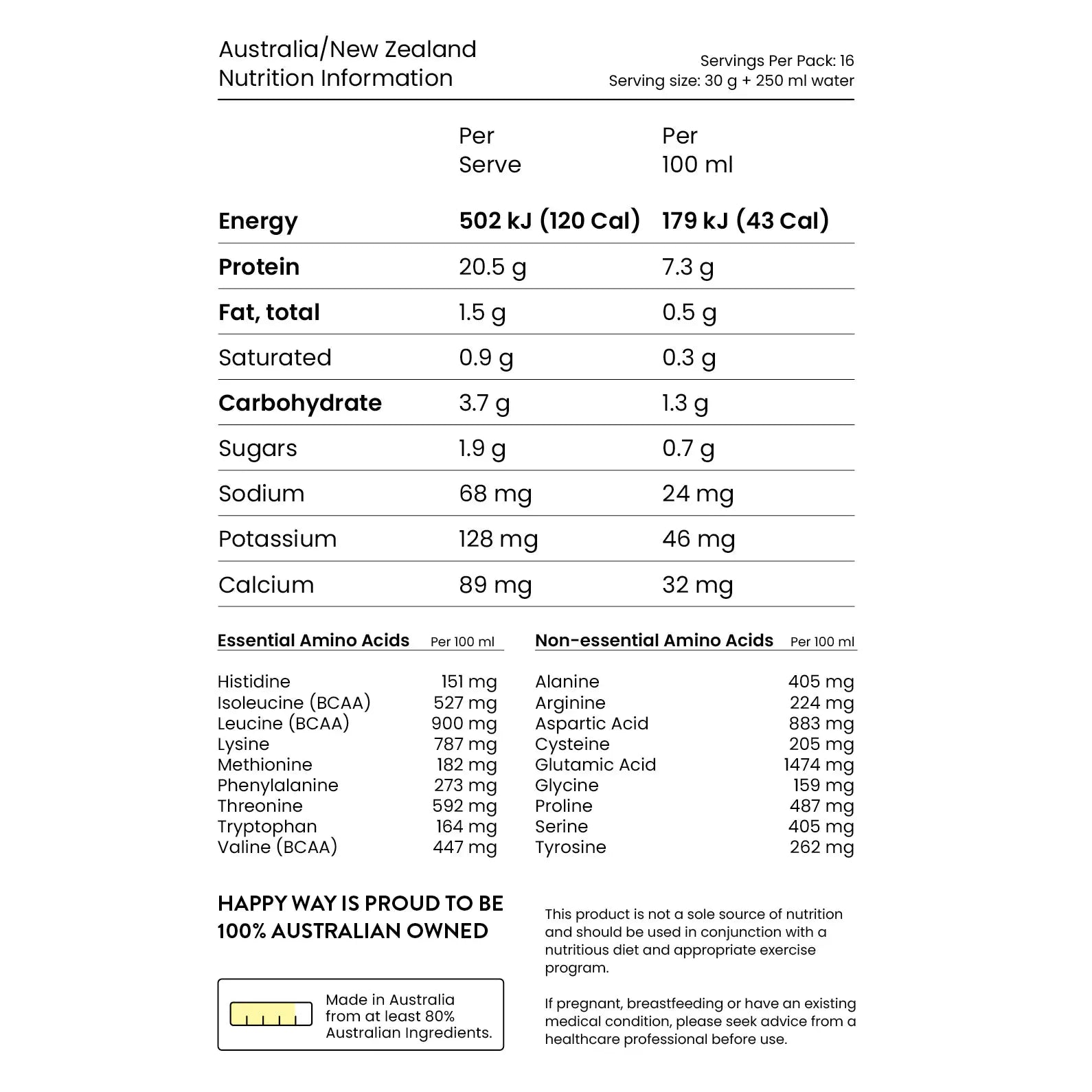 بروتين مصل اللبن المركز 84% [مصل اللبن (حليب)، ليسيثين دوار الشمس]، مسحوق الحليب منزوع الدسم، مسحوق عسل مانوكا المجفف بالتجميد (5%)، نكهة طبيعية، مسحوق جوز الهند (يحتوي على دهون ثلاثية متوسطة السلسلة، صمغ الأكاسيا)، مسحوق الماكا، بذور الشيا العضوية، قشر سيلليوم، محليات (ستيفيول جليكوسيد، ثاوماتين)، ملح صخري من الهيمالايا. خالي من الغلوتين.