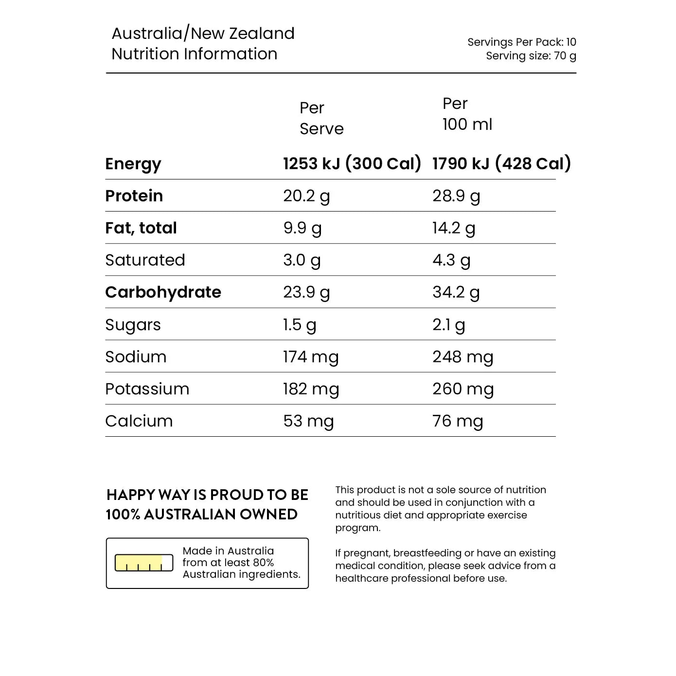 \ شوفان أسترالي سريع (55%)، بروتين مصل اللبن المركز (حليب)، مسحوق الحليب منزوع الدسم، نكهة طبيعية، مسحوق MCT مشتق من جوز الهند، مسحوق الماكا، بذور الشيا، قشر سيلليوم، مُحلي طبيعي (ستيفيول جليكوسيد وثوماتين) ملح صخري من الهيمالايا.