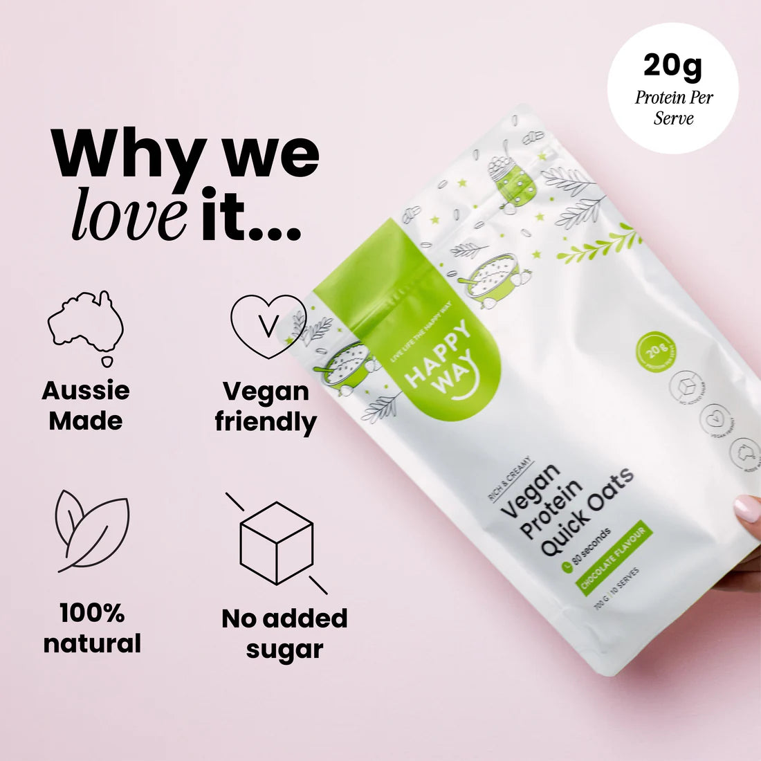 شوفان سريع أسترالي (55%)، مزيج بروتين نباتي (بروتين البازلاء المعزول، بروتين الأرز)، مسحوق الكاكاو، نكهة طبيعية، مسحوق MCT مشتق من جوز الهند، مسحوق الماكا، بذور الشيا، قشر سيلليوم، مُحلي طبيعي (ستيفيول جليكوسيد وثوماتين)، ملح صخري من جبال الهيمالايا.
