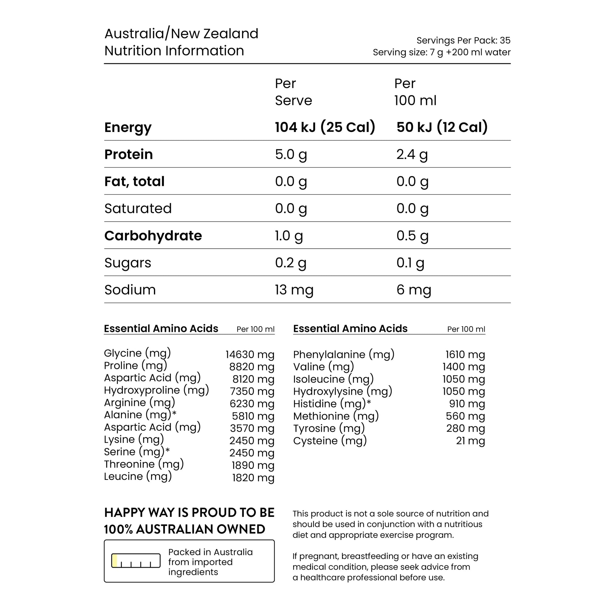 ببتيدات الكولاجين البحري (السمك) (75%)، نكهة طبيعية، إينولين، حمض الستريك، حمض الهيالورونيك، مُحلي طبيعي: ستيفيول جليكوسيدات، ثوماتين، مسحوق مستخلص ذيل الحصان. خالي من الغلوتين.