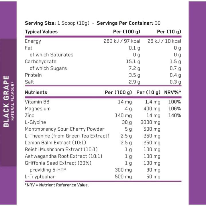 مغنيسيوم بيسجليسينات، L-جلايسين، L-ثيانين، L-تريبتوفان، 5-HTP (5-هيدروكسي تريبتوفان)، خلاصة الترنجان (Lemon Balm)، خلاصة فطر الريشي، خلاصة الأشواغاندا، فيتامين B6، زنك، نكهة طبيعية العنب الأسود.