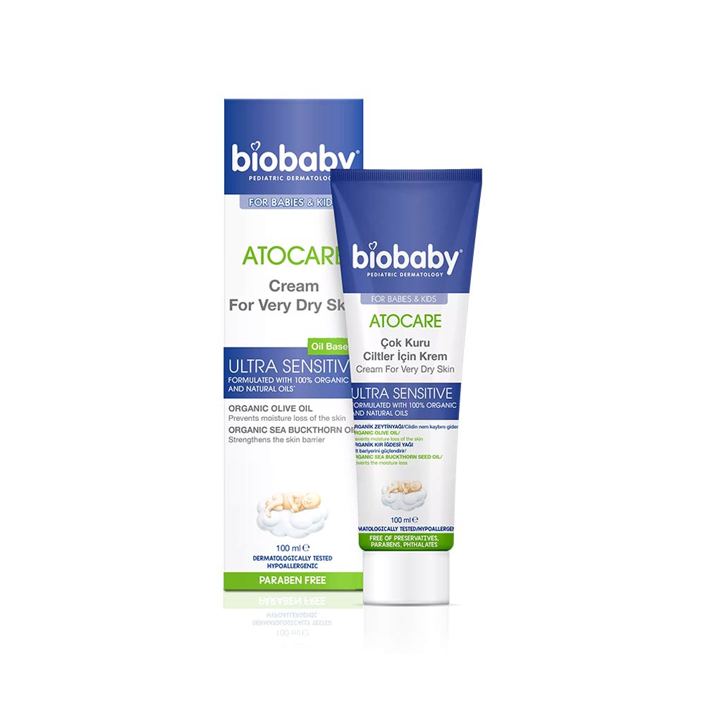 Biobaby Atocare Ultra Sensitive هو كريم علاجي يومي مخصص للبشرة شديدة الجفاف والحساسة لدى الرضع والأطفال. يجمع بين زيت الزيتون العضوي وزيت النبق البحري الغني بالأوميغا‑7 للمساعدة على حبس الرطوبة وتقوية حاجز البشرة مع الحفاظ على نعومتها ومرونتها. تم اختيار هذا المنتج بعناية من هيلث لاند لتوافقه مع معايير العناية النظيفة وجودة العلامة.