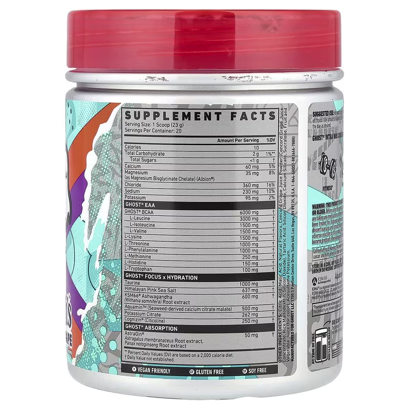 مزيج الأحماض الأمينية الأساسية (EAAs) بما فيها الأحماض الأمينية متفرعة السلسلة (BCAAs)، إلكتروليتات للترطيب، نكهات طبيعية واصطناعية بنكهة العنب Welch’s، منظِّمات حموضة، مواد تحلية غير سكرية، عوامل تكتّل.