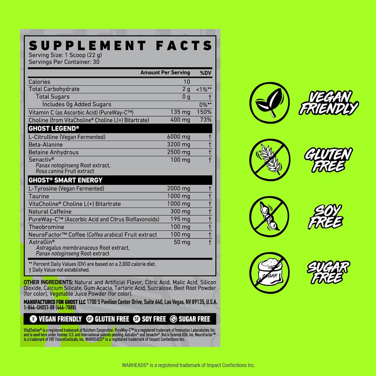 Ghost Legend Pre-Workout بنكهة Warheads الحبحب الحامض هو مكمل ما قبل التمرين المصمّم لمنحك دفعة طاقة نظيفة وتركيزًا ذهنيًا مع إحساس قوي بالضخّ. يجمع بين L‑سيترولين لدعم أكسيد النتريك وتدفّق الدم، وبيتا‑ألانين للمساعدة في تحمّل الجهد، إلى جانب الكافيين المتوازن ومكوّنات داعمة للتركيز مثل الكولين والنووتروبيكس. تم اختيار هذا المنتج بعناية من هيلث لاند لالتزامه بجودة المكوّنات ونهج نظيف يلبّي احتياجات الرياضيين والمهتمين بالصحة.