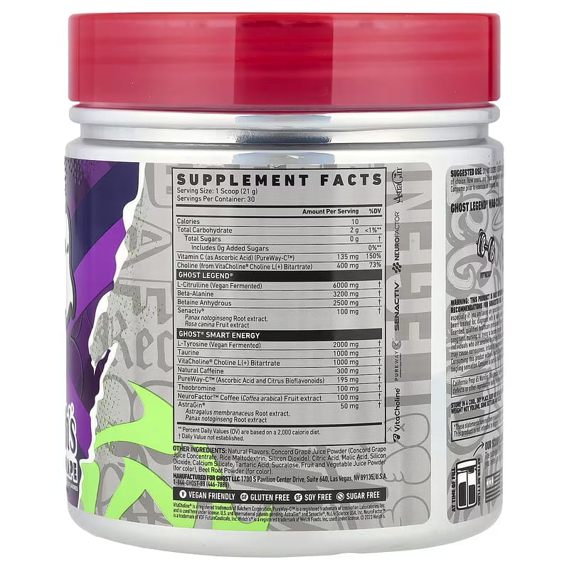 تم تطوير Ghost Legend Pre-Workout لمنحك بداية قوية لكل حصة تدريبية عبر مزيج من مكونات الطاقة والتركيز وضخ الدم. تركيبة ما قبل التمرين هذه تستهدف احتياجات الرياضيين الذين يرغبون في أداء ثابت، ذهني وجسدي، مع نكهة عنب Welch’s المحبوبة التي تجعل الخلط والشرب تجربة ممتعة. بفضل سمعته الموثوقة في عالم التغذية الرياضية، يجمع المنتج بين عناصر داعمة للضخ والتحمّل والتركيز لنتائج ملموسة. تم اختياره بعناية من قِبل Healthland ليتماشى مع فلسفة المنتجات النظيفة والجودة العالية.