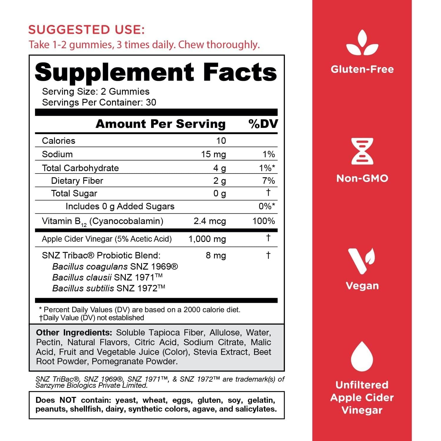 خل التفاح غير المصفّى، فيتامين B12، بروبيوتيك (سلالات بكتيريا نافعة)، قاعدة نباتية خالية من الجيلاتين وخالية من الغلوتين، نكهات طبيعية ومكونات نباتية للمساعدة على التماسك.