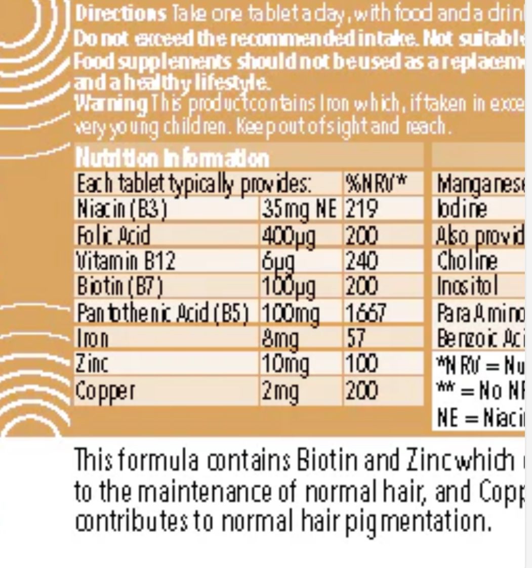 بيوتين، زنك، حمض البانتوثينيك، نياسين، فيتامين ب12، حديد، نحاس، يود، كولين بترترات، إينوزيتول، PABA، مواد مالئة طبيعية، مواد مضادة للتكتل نباتية.