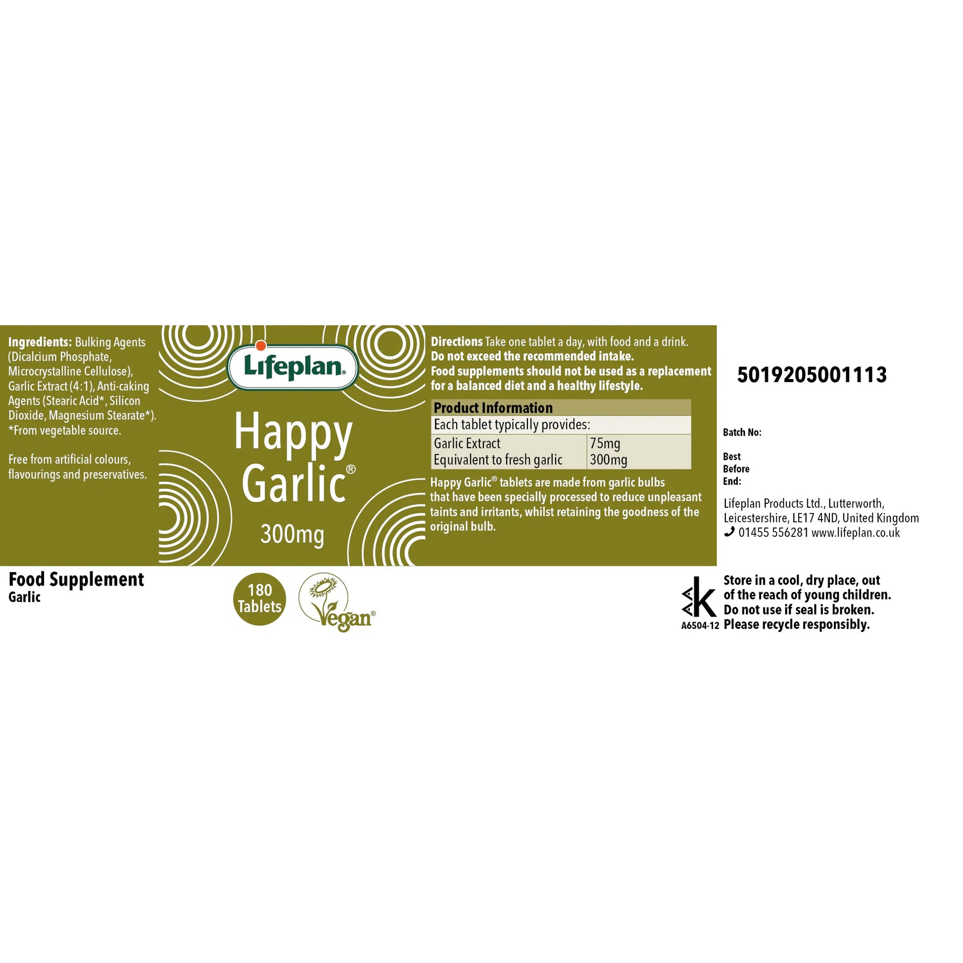 صُنعت أقراص هابي ثوم هابي من لايف بلان من بصيلات الثوم التي تمت معالجتها خصيصًا لتقليل الملوثات والمهيجات غير المستحبة، مع الاحتفاظ بمزايا البصلة الأصلية. تحتوي على مكون موحد عالي التركيز مع مبادئ نشطة من بصيلات الثوم الطازجة الكاملة.