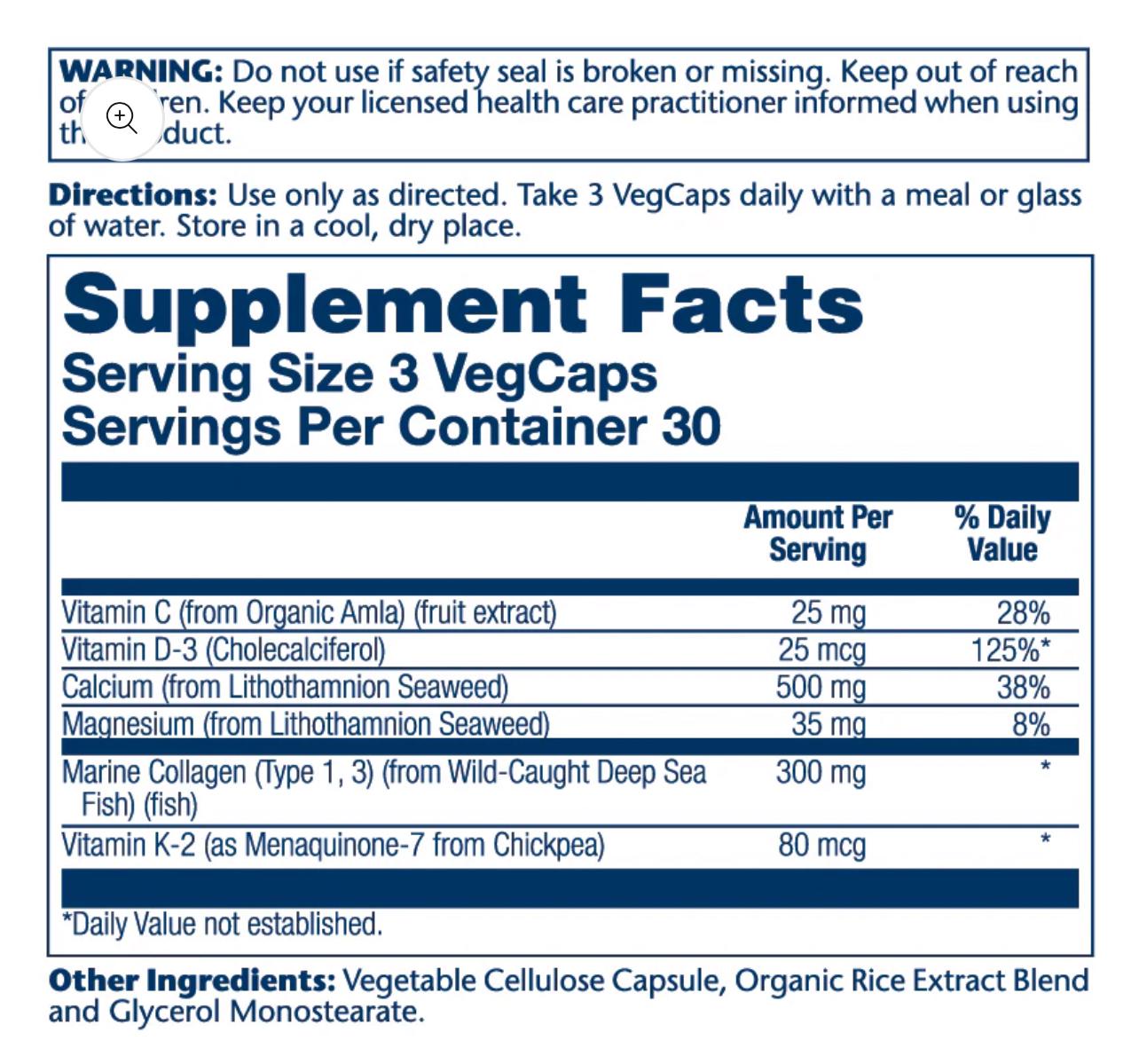 كولاجين نوع 1 و3 (من أسماك البحر العميق)، كالسيوم (من الأعشاب البحرية)، مغنيسيوم (من الأعشاب البحرية)، فيتامين D3 (كوليكالسيفيرول من الأكاي)، فيتامين C (مستخلص الأملا)، فيتامين K2 (ميناقينون-7 من الحمص)، كبسولة من السليلوز النباتي، مستخلص أرز عضوي، أحادي ستيرات الجلسرين.