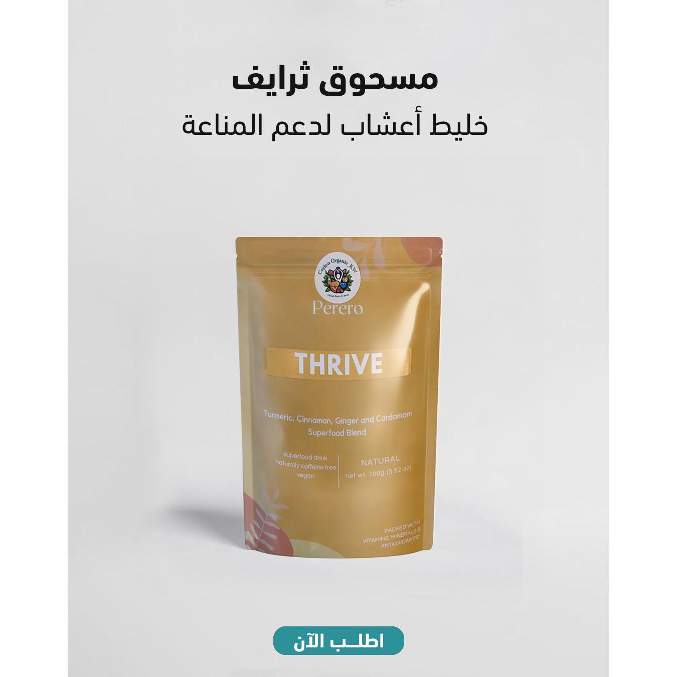 1- مشروب ثرايف سوبر فود مع الكركم، القرفة، الزنجبيل، والهيل، خالي من الكافيين بشكل طبيعي، نباتي