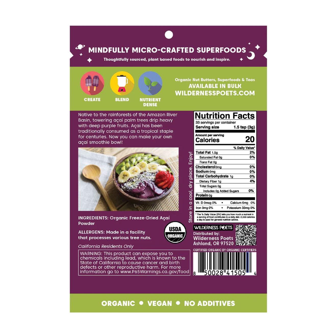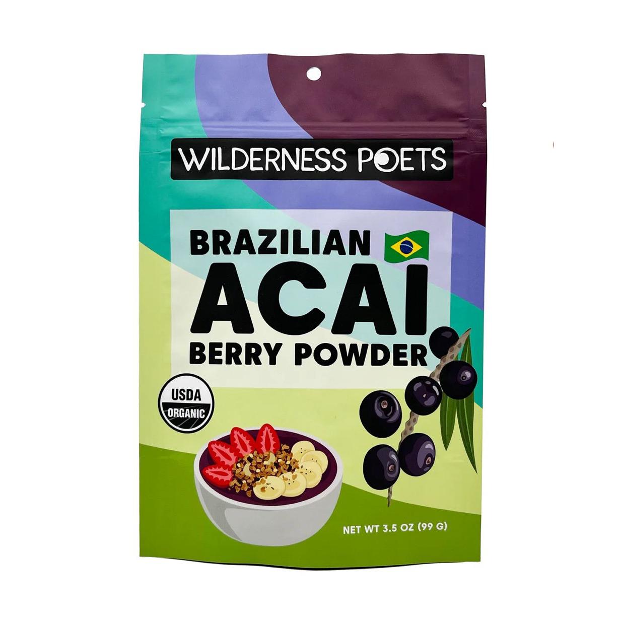 Wilderness Poets Organic Freeze Dried Acai Powder هو مسحوق أساي برازيلي عضوي ناعم، مجفف بالتجميد للحفاظ على العناصر النشطة والطعم الفاكهي المركز. يشتهر الأساي بمحتواه من الأنثوسيانين المضاد للأكسدة، إضافة إلى الألياف والدهون النباتية المفيدة، ما يجعله إضافة ذكية لوصفات الإفطار والسموثي.